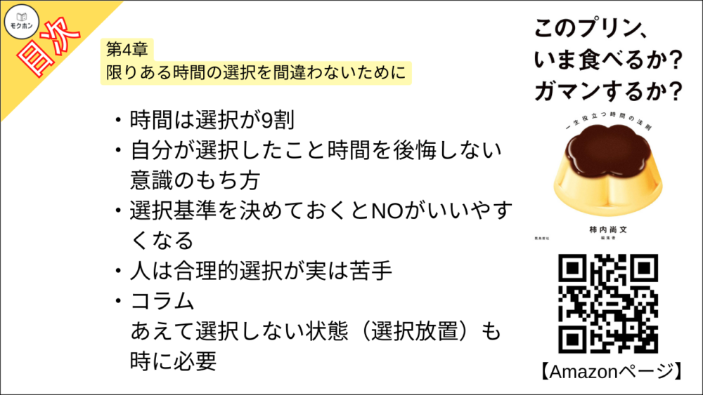 【このプリン、いま食べるか? ガマンするか? 一生役立つ時間の法則 目次】第4章 限りある時間の選択を間違わないために【柿内尚文・要約・もくじ】