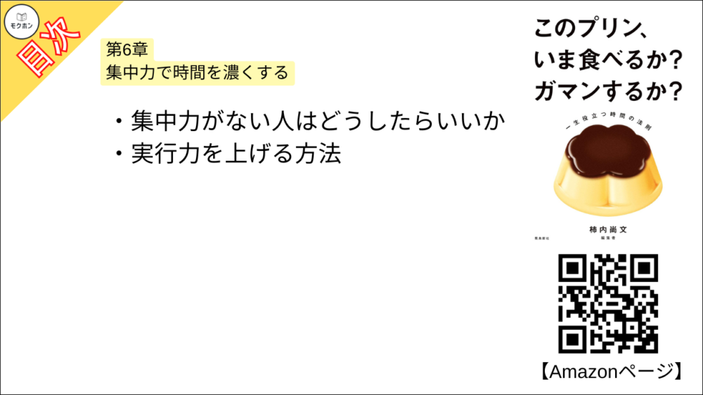 【このプリン、いま食べるか? ガマンするか? 一生役立つ時間の法則 目次】第6章 集中力で時間を濃くする【柿内尚文・要約・もくじ】