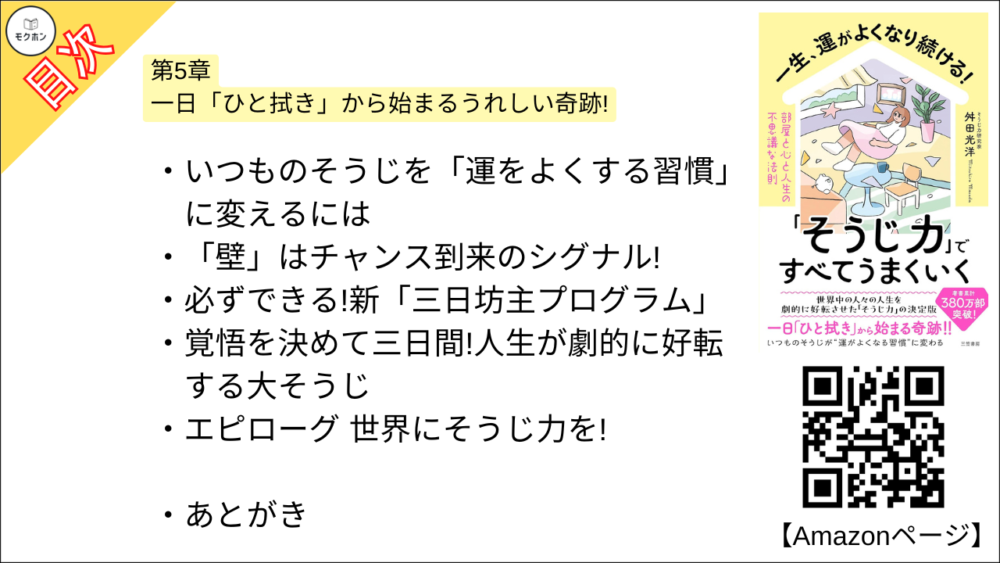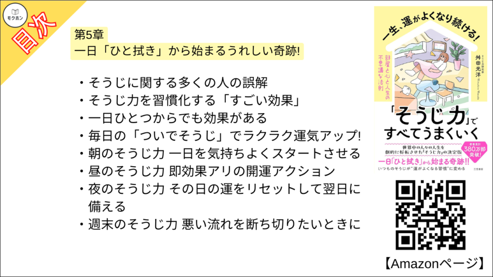 【一生、運がよくなり続ける!「そうじ力」ですべてうまくいく 部屋と心と人生の不思議な法則 目次】第5章 一日「ひと拭き」から始まるうれしい奇跡!【舛田光洋・要約・もくじ】