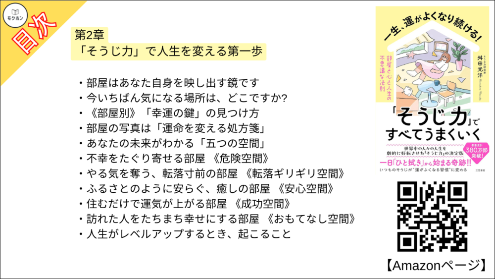 舛田光洋さんの「一生、運がよくなり続ける!「そうじ力」ですべてうまくいく 部屋と心と人生の不思議な法則」の全もくじを紹介します。