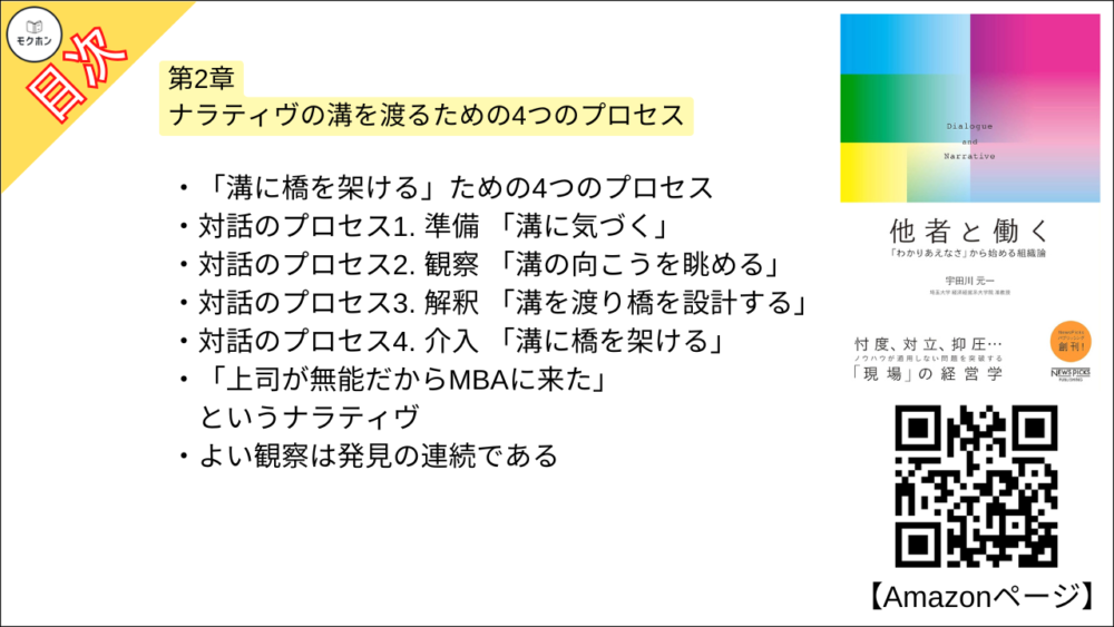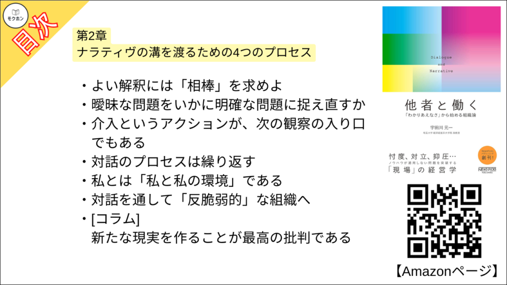 【他者と働く──「わかりあえなさ」から始める組織論 目次】第2章 ナラティヴの溝を渡るための4つのプロセス【宇田川元一・要約・もくじ】
