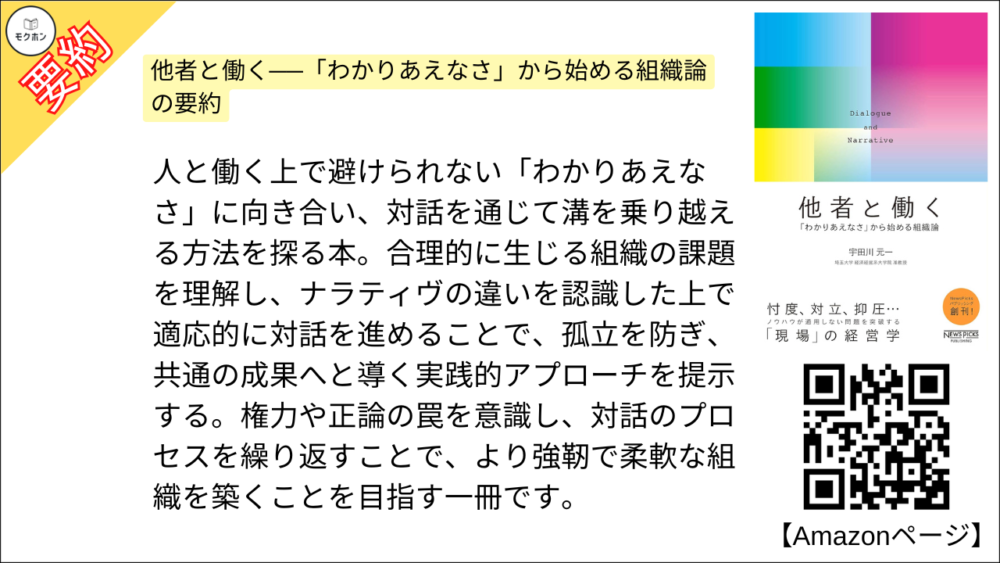 人と働く上で避けられない「わかりあえなさ」に向き合い、対話を通じて溝を乗り越える方法を探る本。合理的に生じる組織の課題を理解し、ナラティヴの違いを認識した上で適応的に対話を進めることで、孤立を防ぎ、共通の成果へと導く実践的アプローチを提示する。権力や正論の罠を意識し、対話のプロセスを繰り返すことで、より強靭で柔軟な組織を築くことを目指す一冊です。