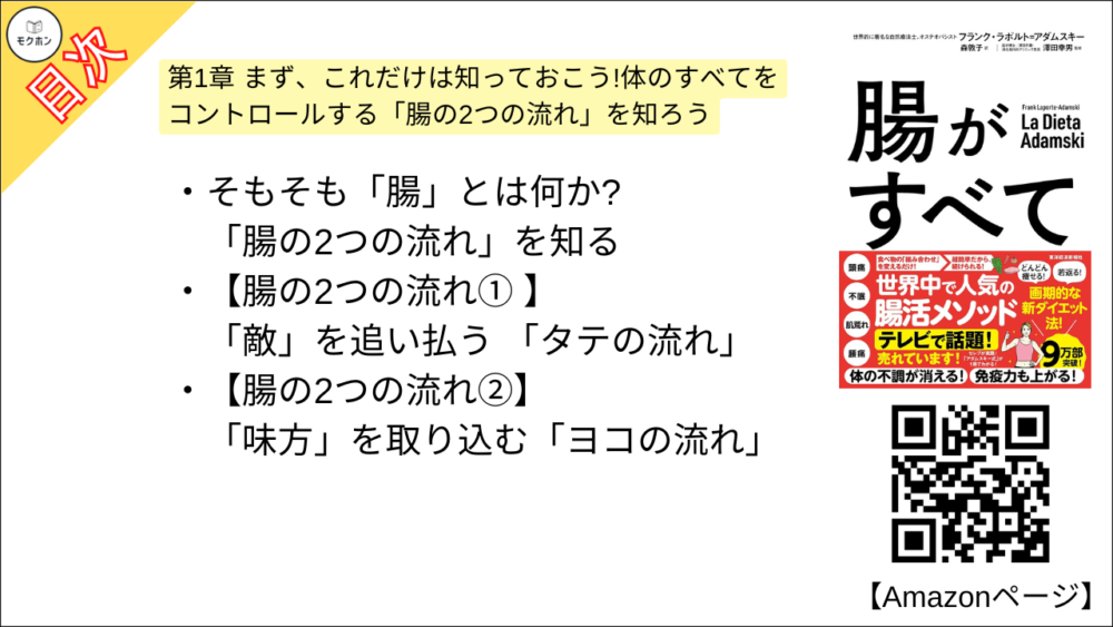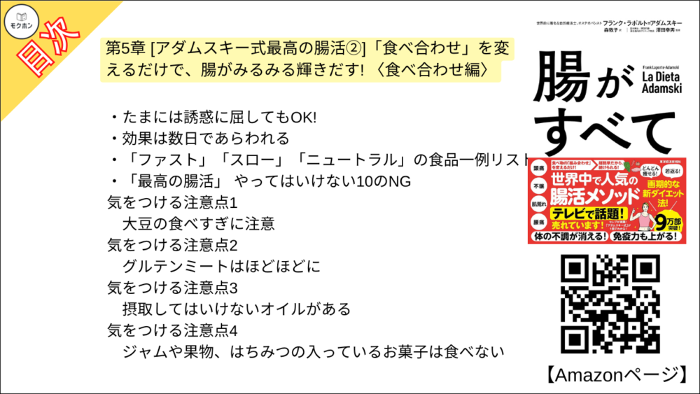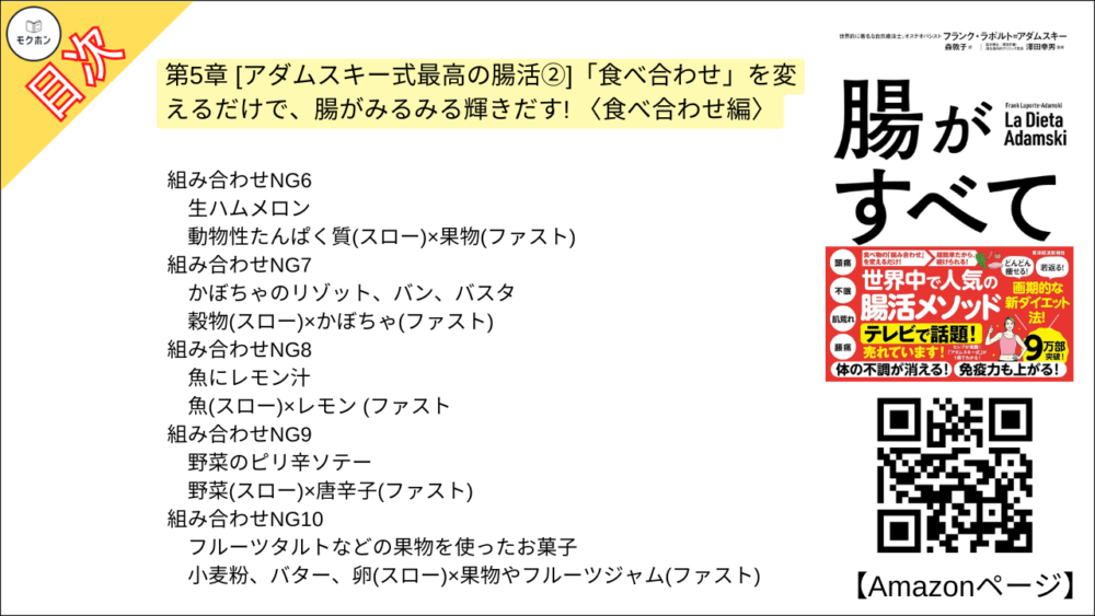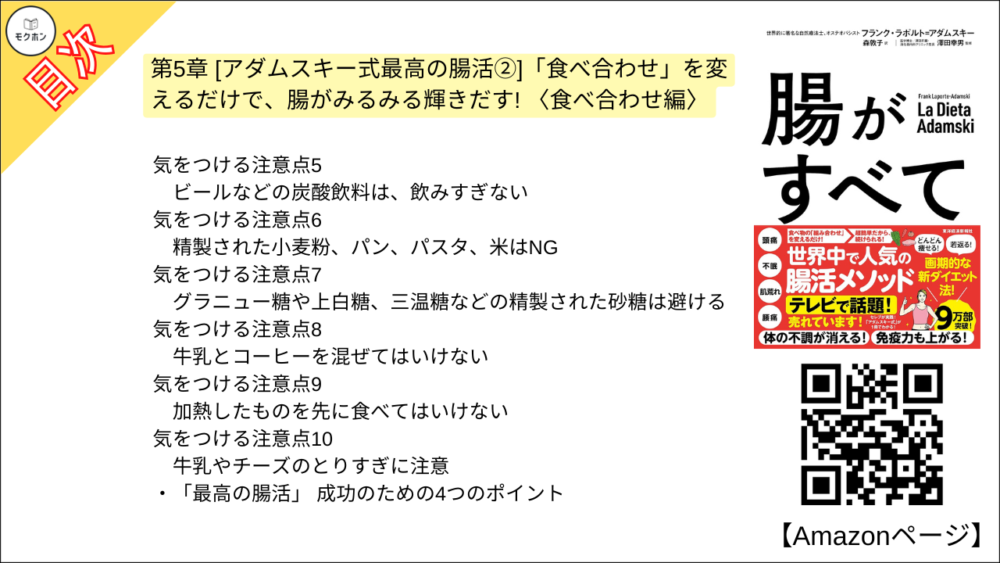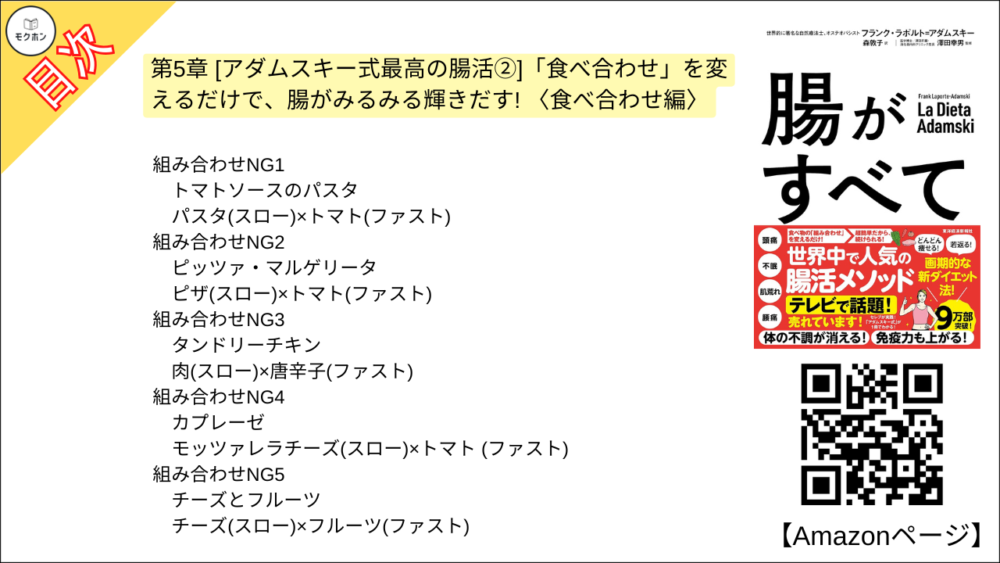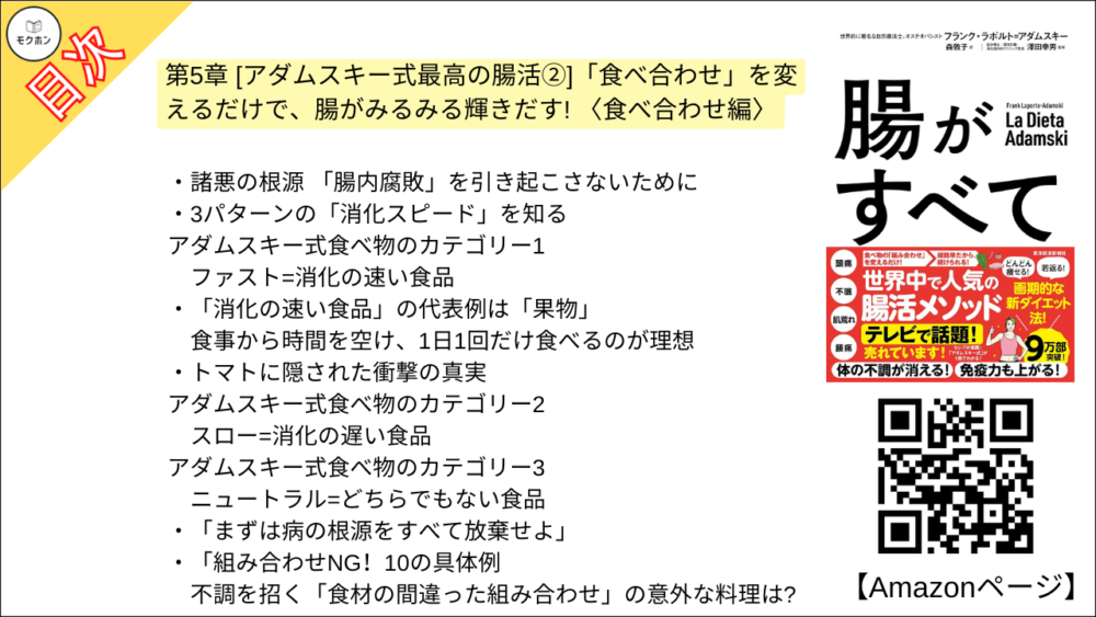 ![【腸がすべて: 世界中で話題!アダムスキー式「最高の腸活」メソッド 目次】第5章 [アダムスキー式最高の腸活②]「食べ合わせ」を変えるだけで、腸がみるみる輝きだす!〈食べ合わせ編〉【フランク・ラポルト=アダムスキー・要約・もくじ】](https://mokuhon.net/wp-content/uploads/2025/02/10-12-1000x563.png)