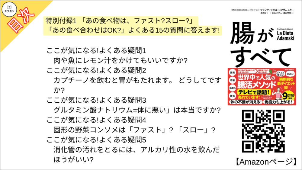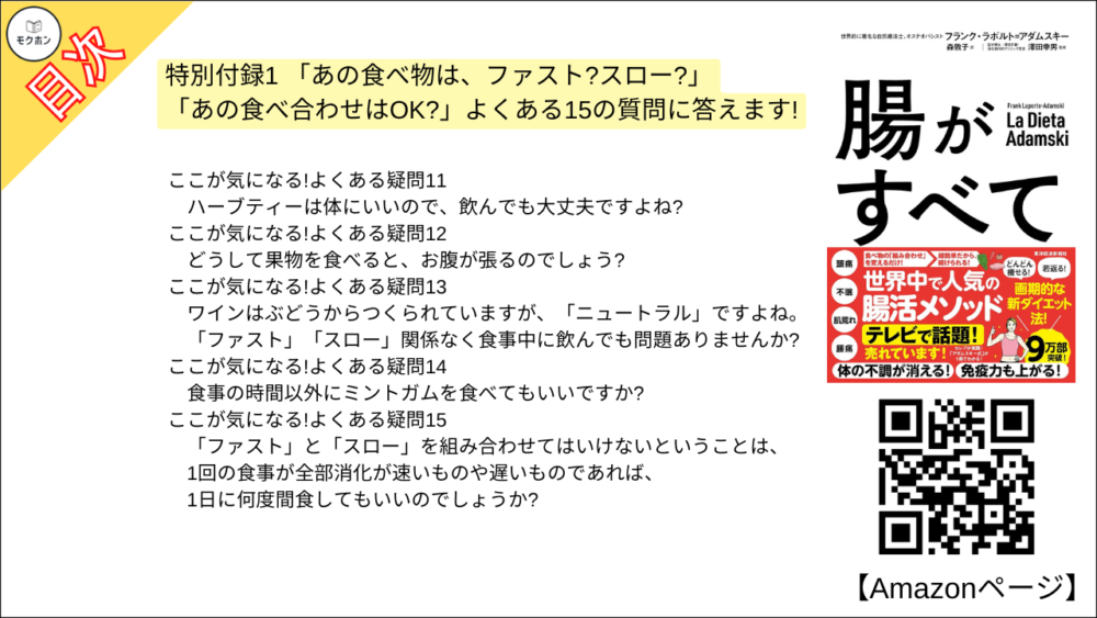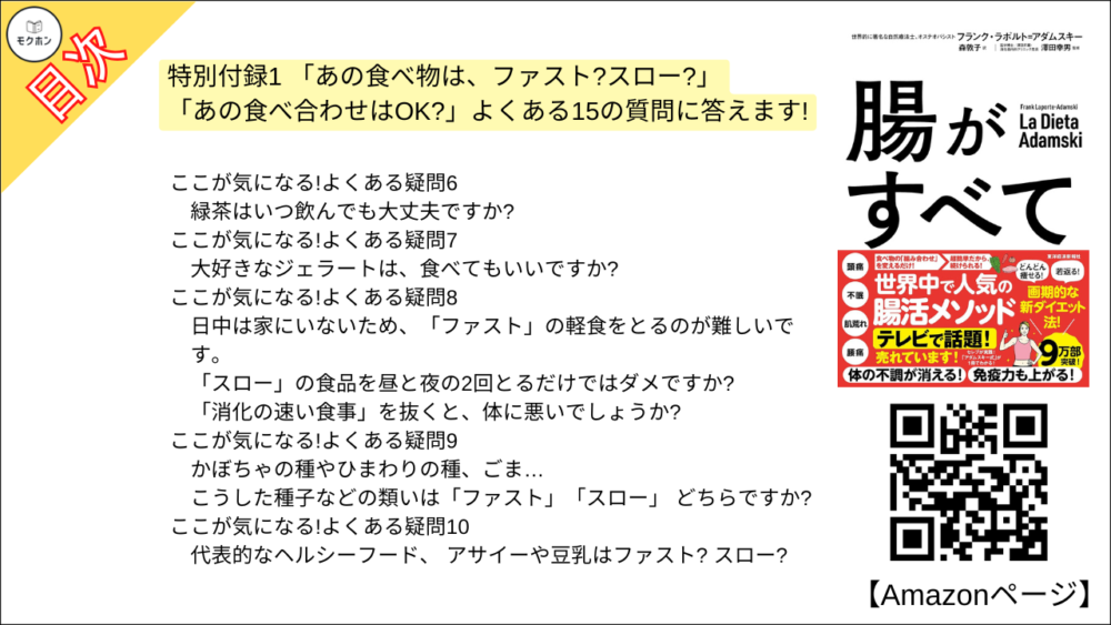 【腸がすべて: 世界中で話題!アダムスキー式「最高の腸活」メソッド 目次】特別付録1 「あの食べ物は、ファスト?スロー?」「あの食べ合わせはOK?」よくある15の質問に答えます!【フランク・ラポルト=アダムスキー・要約・もくじ】