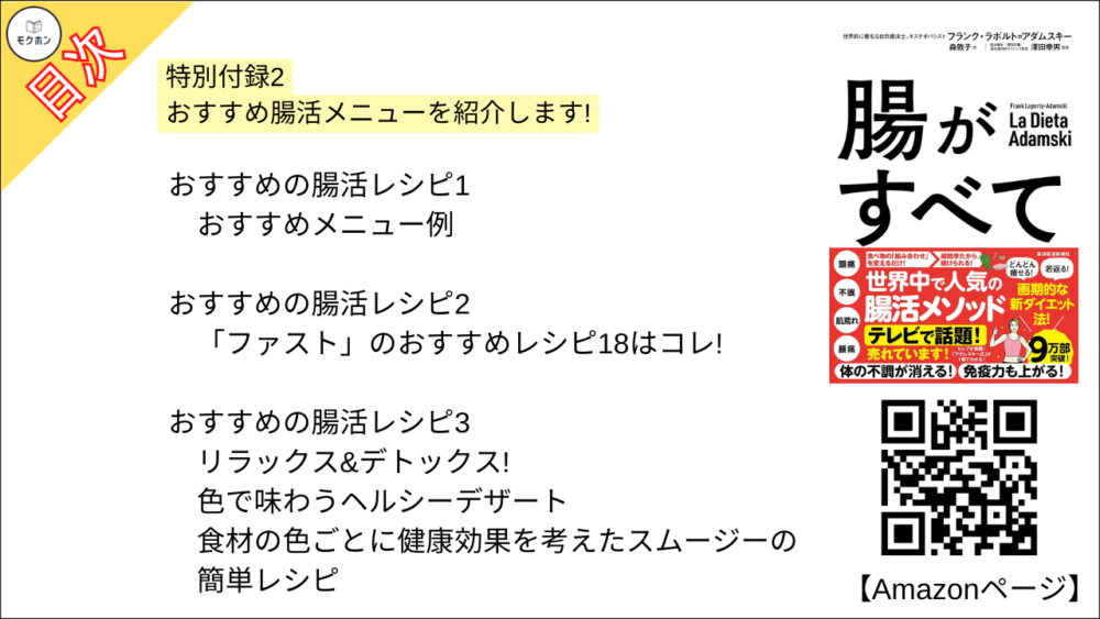 【腸がすべて: 世界中で話題!アダムスキー式「最高の腸活」メソッド 目次】特別付録2 おすすめ腸活メニューを紹介します!【フランク・ラポルト=アダムスキー・要約・もくじ】