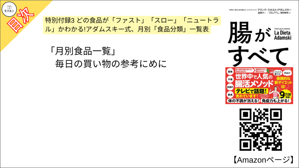 【腸がすべて: 世界中で話題!アダムスキー式「最高の腸活」メソッド 目次】特別付録3 どの食品が「ファスト」「スロー」「ニュートラル」かわかる!アダムスキー式、月別「食品分類」一覧表【フランク・ラポルト=アダムスキー・要約・もくじ】