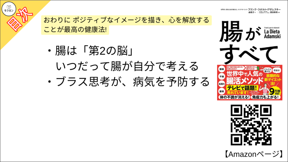 【腸がすべて: 世界中で話題!アダムスキー式「最高の腸活」メソッド 目次】おわりに ポジティブなイメージを描き、心を解放することが最高の健康法!【フランク・ラポルト=アダムスキー・要約・もくじ】