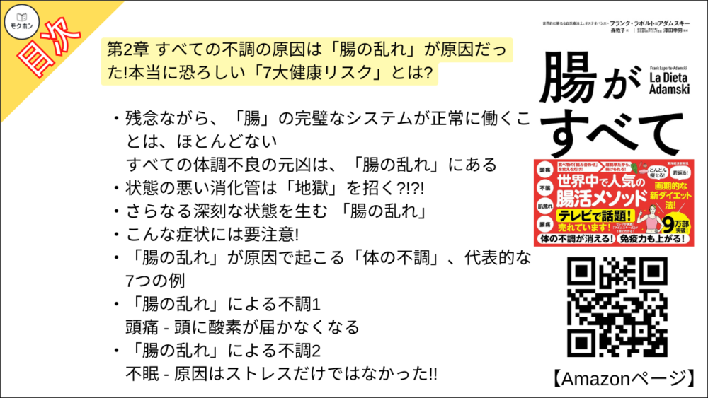 【腸がすべて: 世界中で話題!アダムスキー式「最高の腸活」メソッド 目次】第2章 すべての不調の原因は「腸の乱れ」が原因だった!本当に恐ろしい「7大健康リスク」とは?【フランク・ラポルト=アダムスキー・要約・もくじ】