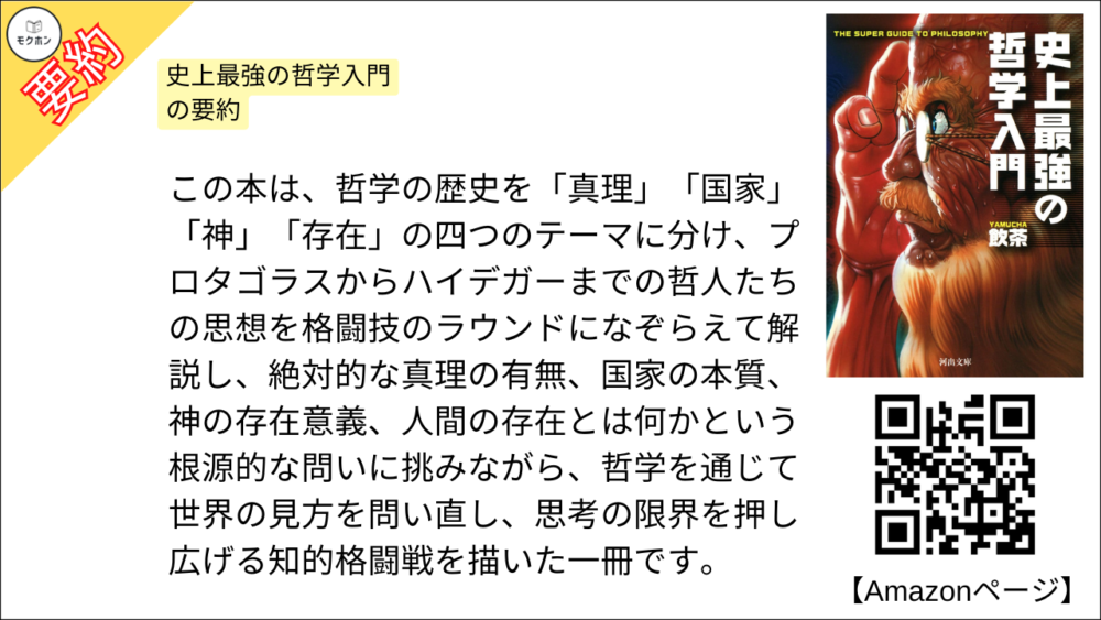 この本は、哲学の歴史を「真理」「国家」「神」「存在」の四つのテーマに分け、プロタゴラスからハイデガーまでの哲人たちの思想を格闘技のラウンドになぞらえて解説し、絶対的な真理の有無、国家の本質、神の存在意義、人間の存在とは何かという根源的な問いに挑みながら、哲学を通じて世界の見方を問い直し、思考の限界を押し広げる知的格闘戦を描いた一冊です。