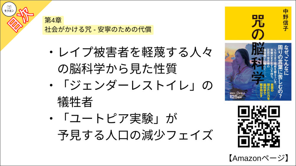【咒(まじない)の脳科学 目次】第4章 社会がかける咒 – 安寧のための代償【中野信子・要約・もくじ】