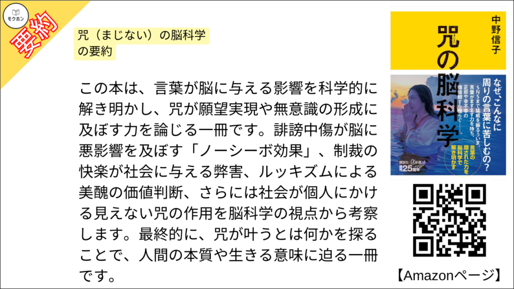 この本は、言葉が脳に与える影響を科学的に解き明かし、咒が願望実現や無意識の形成に及ぼす力を論じる一冊です。誹謗中傷が脳に悪影響を及ぼす「ノーシーボ効果」、制裁の快楽が社会に与える弊害、ルッキズムによる美醜の価値判断、さらには社会が個人にかける見えない咒の作用を脳科学の視点から考察します。最終的に、咒が叶うとは何かを探ることで、人間の本質や生きる意味に迫る一冊です。