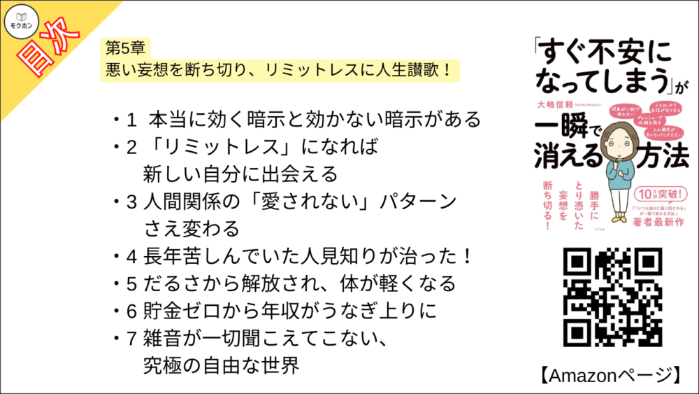 【「すぐ不安になってしまう」が一瞬で消える方法 目次】第5章 悪い妄想を断ち切り、リミットレスに人生讃歌!【大嶋信頼・要約・もくじ】