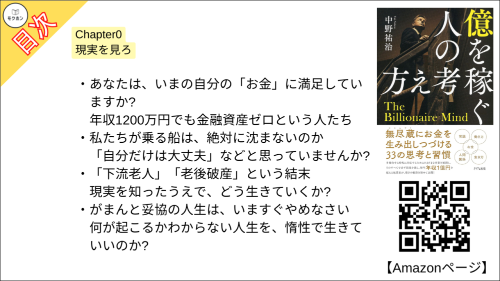 【億を稼ぐ人の考え方 目次】Chapter0 現実を見ろ【中野祐治・要点・もくじ】