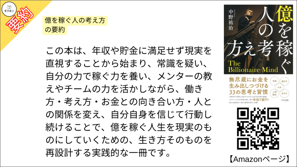 この本は、年収や貯金に満足せず現実を直視することから始まり、常識を疑い、自分の力で稼ぐ力を養い、メンターの教えやチームの力を活かしながら、働き方・考え方・お金との向き合い方・人との関係を変え、自分自身を信じて行動し続けることで、億を稼ぐ人生を現実のものにしていくための、生き方そのものを再設計する実践的な一冊です。
