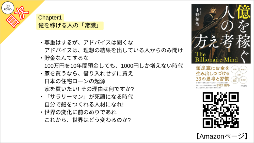 【億を稼ぐ人の考え方 目次】Chapter1 億を稼げる人の「常識」【中野祐治・要点・もくじ】