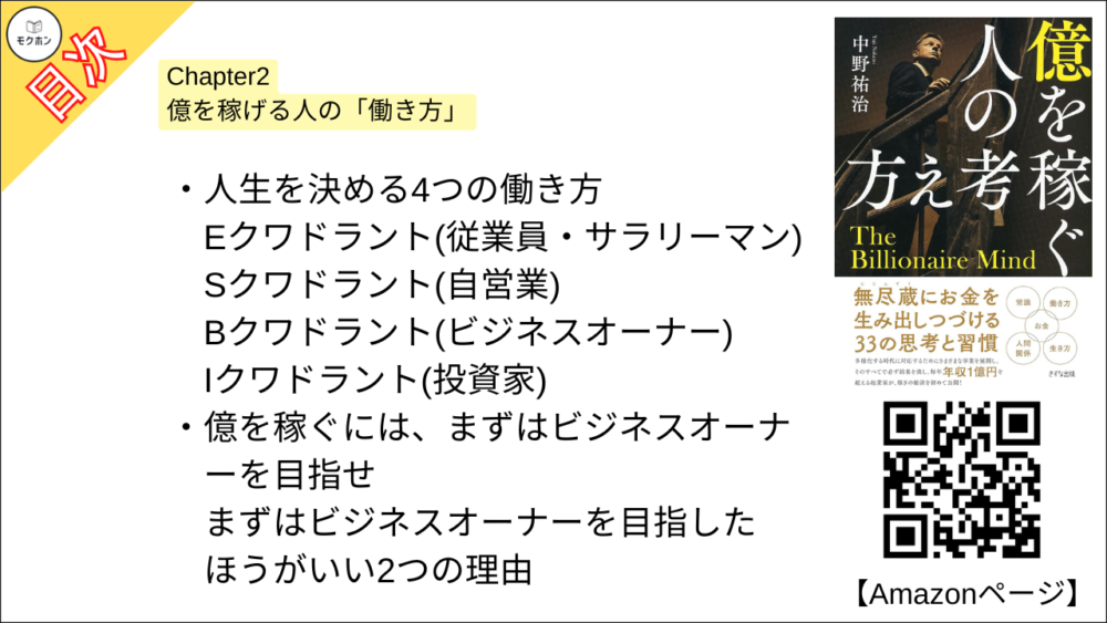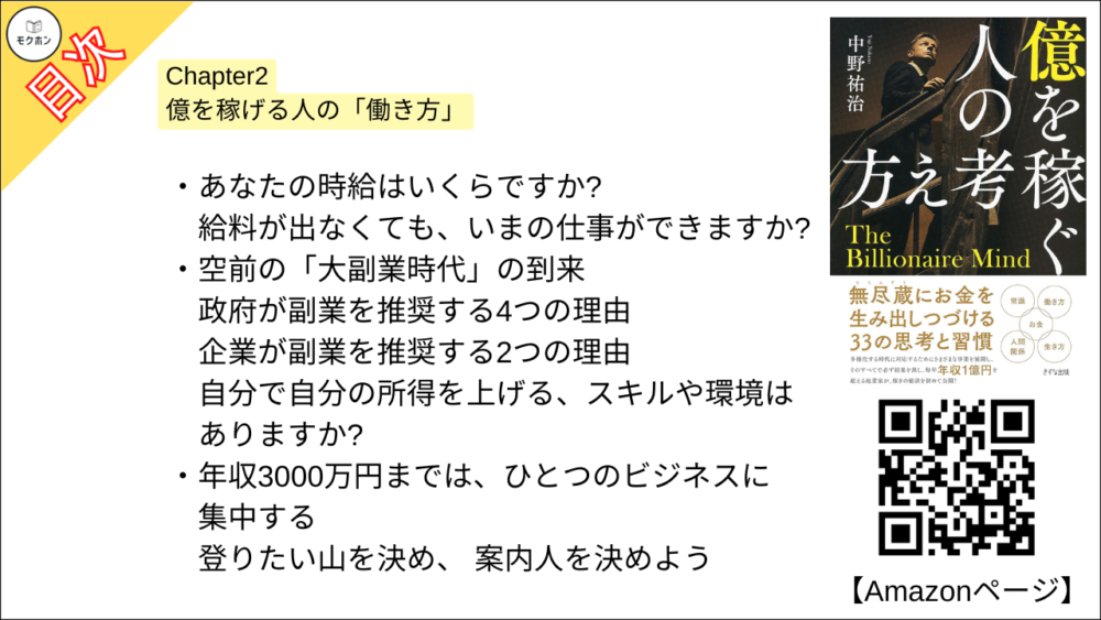 【億を稼ぐ人の考え方 目次】Chapter2 億を稼げる人の「働き方」【中野祐治・要点・もくじ】