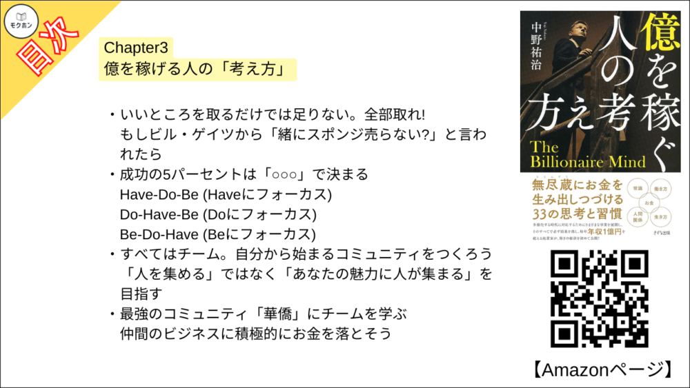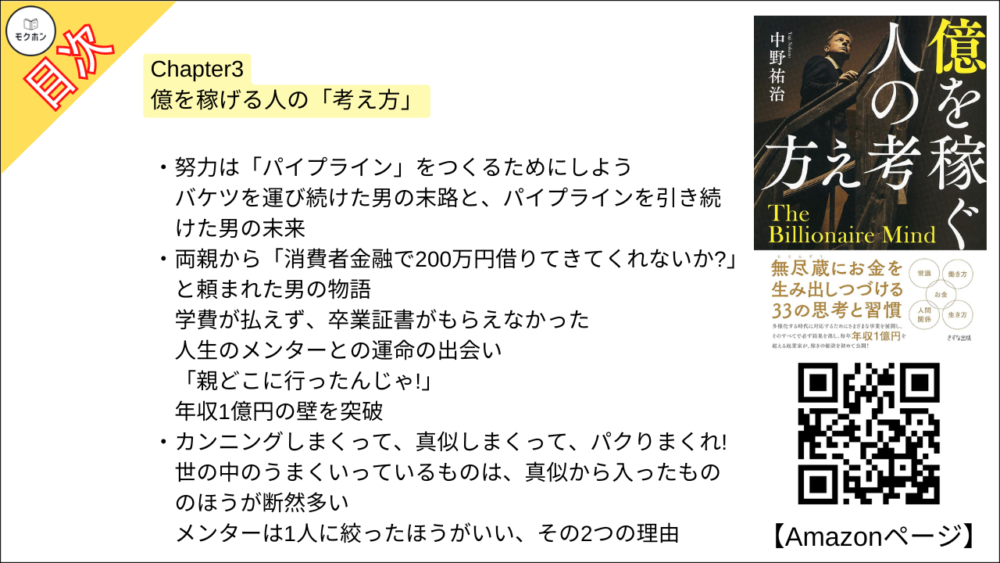 【億を稼ぐ人の考え方 目次】Chapter3 億を稼げる人の「考え方」【中野祐治・要点・もくじ】