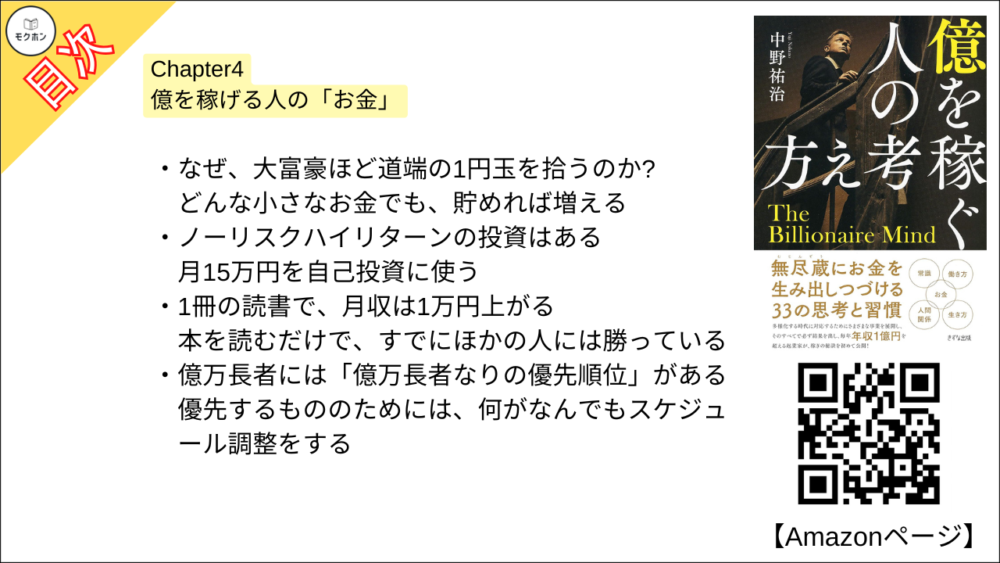【億を稼ぐ人の考え方 目次】Chapter4 億を稼げる人の「お金」【中野祐治・要点・もくじ】