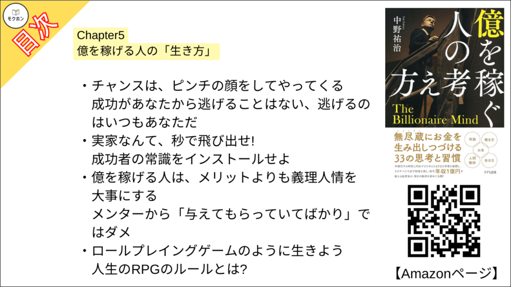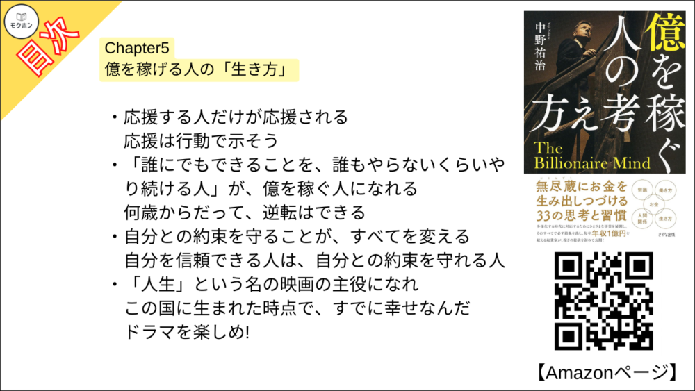 【億を稼ぐ人の考え方 目次】Chapter5 億を稼げる人の「生き方」【中野祐治・要点・もくじ】
