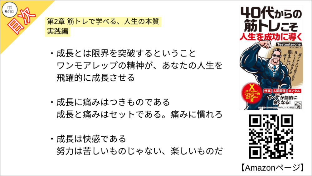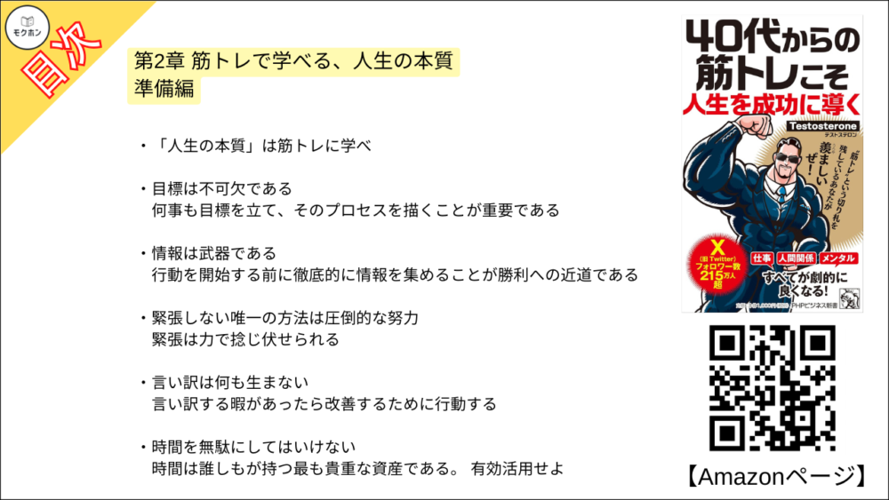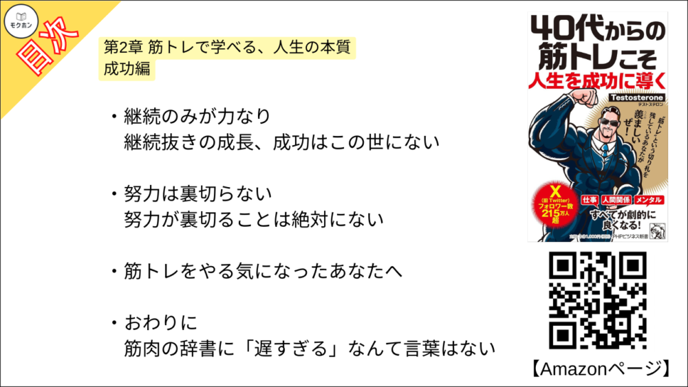 Testosterone(テストステロン) さんの「40代からの筋トレこそ人生を成功に導く」の全もくじを紹介します。