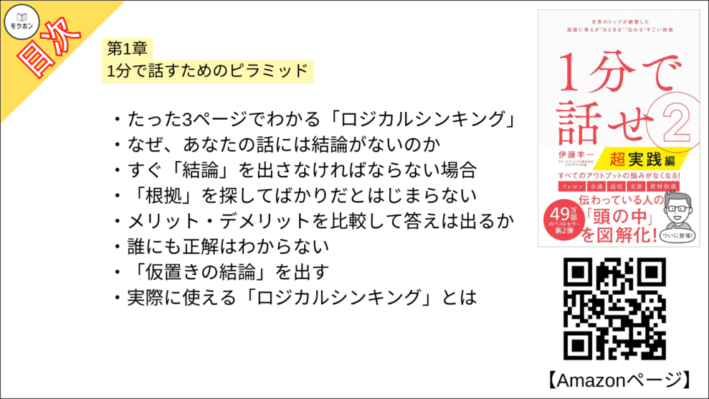 伊藤羊一さんの「1分で話せ2【超実践編】 世界のトップが絶賛した即座に考えが“まとまる”“伝わる”すごい技術」の全もくじを紹介します。