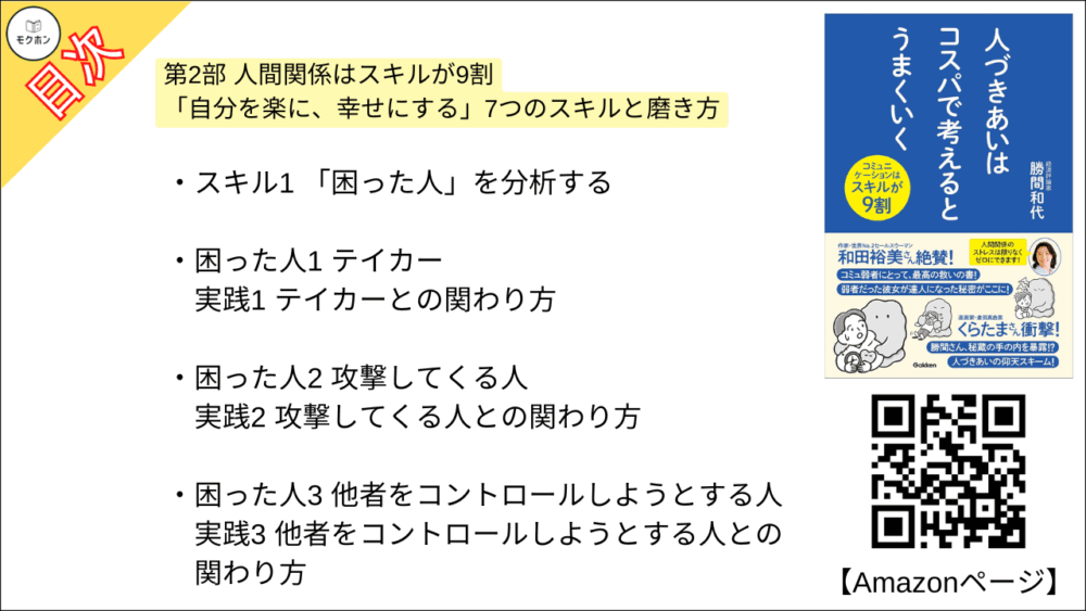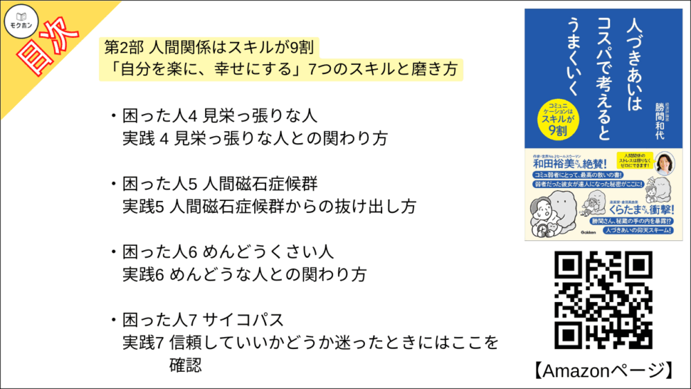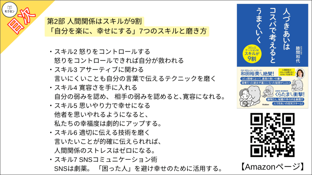 【人づきあいはコスパで考えるとうまくいく 目次】第2部 人間関係はスキルが9割 「自分を楽に、幸せにする」7つのスキルと磨き方【勝間和代・要点・もくじ】
