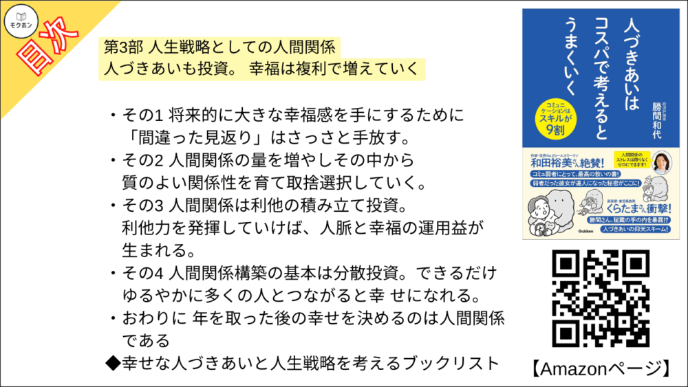 【人づきあいはコスパで考えるとうまくいく 目次】第3部 人生戦略としての人間関係 人づきあいも投資。 幸福は複利で増えていく【勝間和代・要点・もくじ】