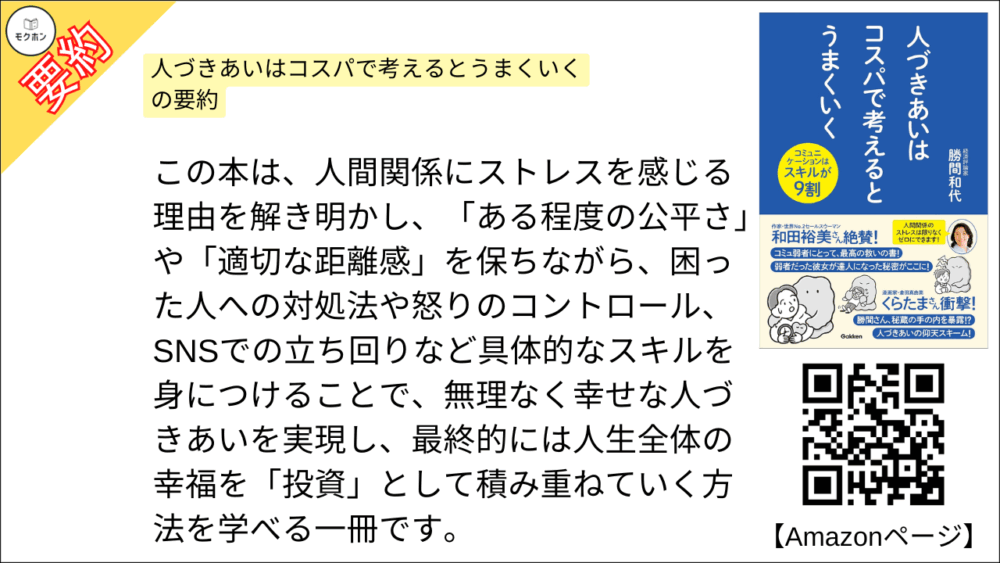 この本は、人間関係にストレスを感じる理由を解き明かし、「ある程度の公平さ」や「適切な距離感」を保ちながら、困った人への対処法や怒りのコントロール、SNSでの立ち回りなど具体的なスキルを身につけることで、無理なく幸せな人づきあいを実現し、最終的には人生全体の幸福を「投資」として積み重ねていく方法を学べる一冊です。