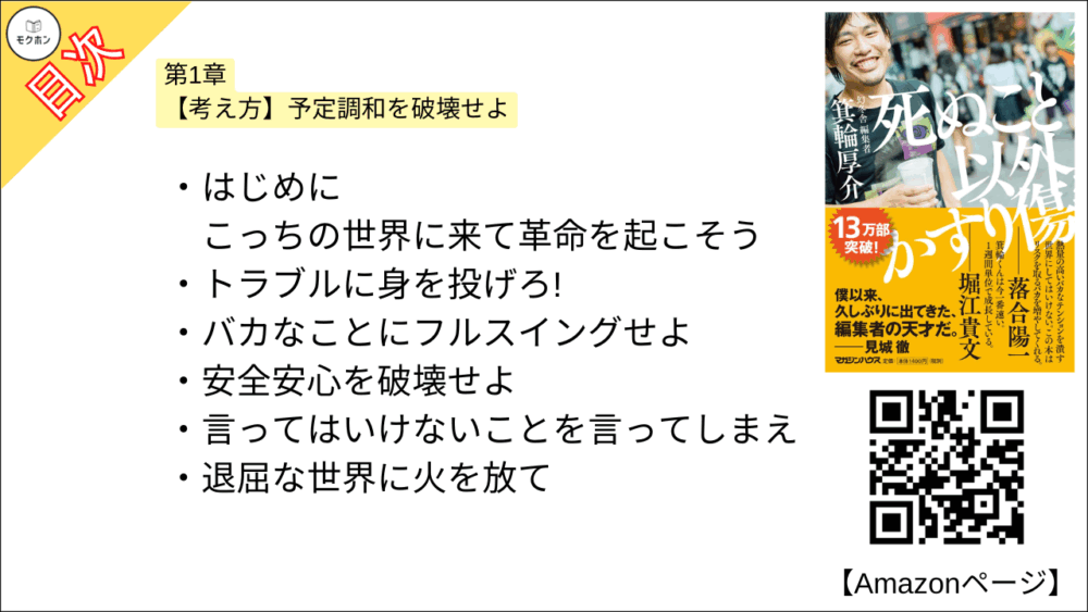 【死ぬこと以外かすり傷 目次】第1章【考え方】予定調和を破壊せよ【箕輪厚介・要点・もくじ】