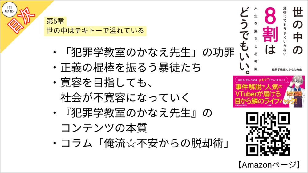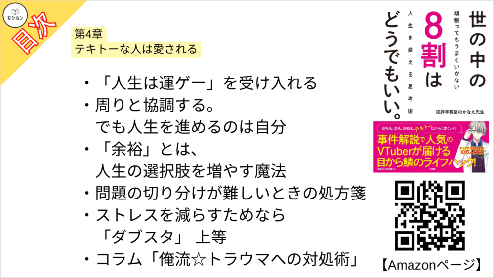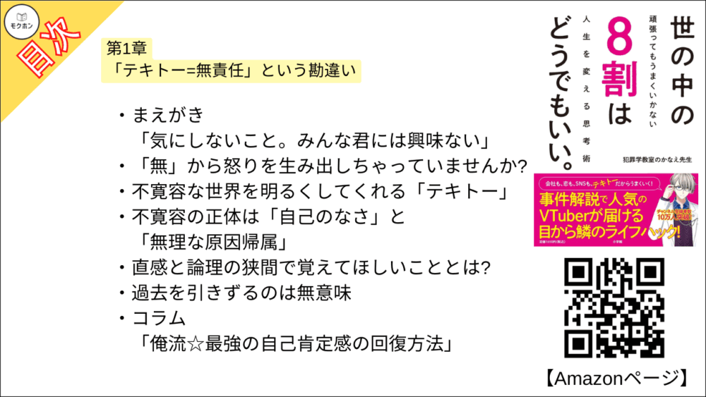 犯罪学教室のかなえ先生さんの「世の中の8割はどうでもいい。: 頑張ってもうまくいかない人生を変える思考術」の全もくじを紹介します。