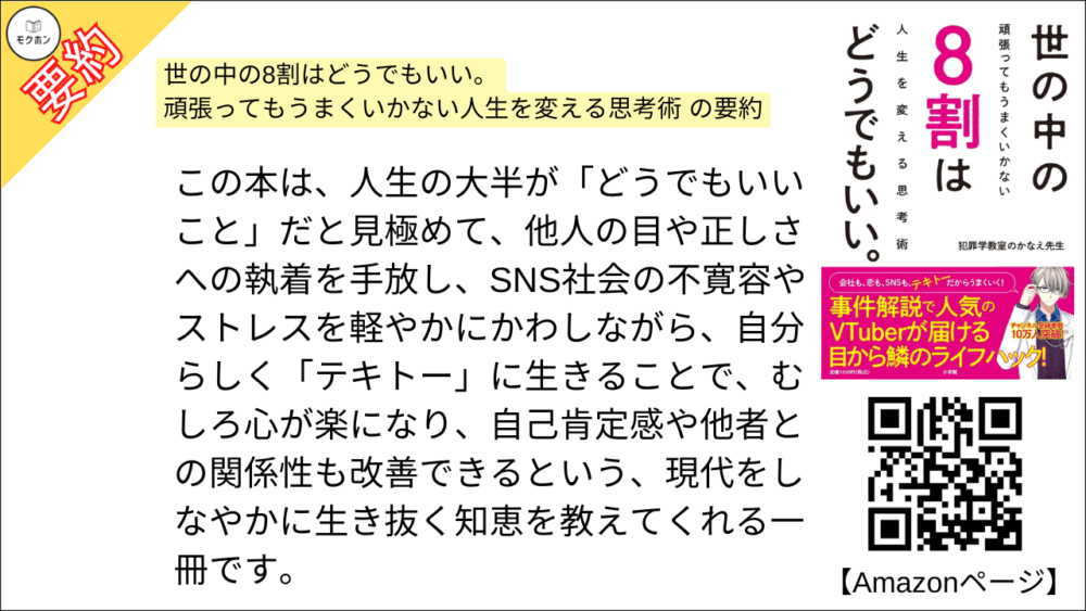 【全目次】世の中の8割はどうでもいい。: 頑張ってもうまくいかない人生を変える思考術 / 犯罪学教室のかなえ先生【要約・もくじ・評価感想】#世の中の8割はどうでもいい #人生を変える思考術 #犯罪学教室のかなえ先生