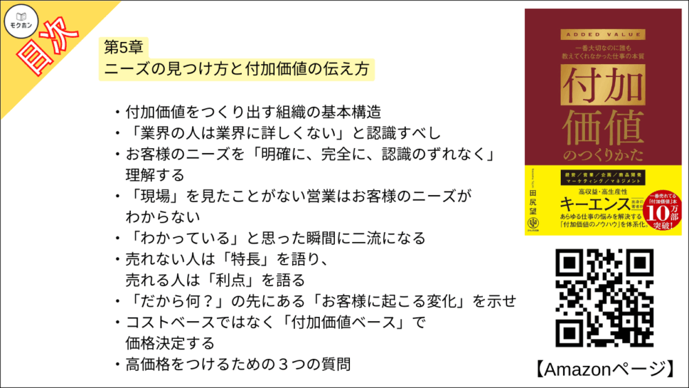 【付加価値のつくりかた 目次】第5章 ニーズの見つけ方と付加価値の伝え方【田尻望・要点・もくじ】