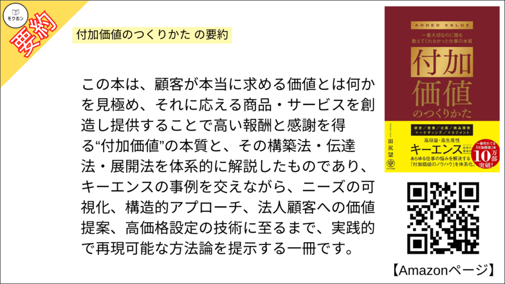 この本は、顧客が本当に求める価値とは何かを見極め、それに応える商品・サービスを創造し提供することで高い報酬と感謝を得る“付加価値”の本質と、その構築法・伝達法・展開法を体系的に解説したものであり、キーエンスの事例を交えながら、ニーズの可視化、構造的アプローチ、法人顧客への価値提案、高価格設定の技術に至るまで、実践的で再現可能な方法論を提示する一冊です。