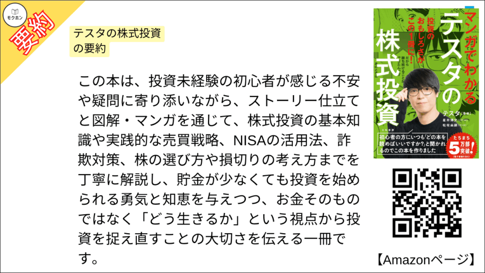 この本は、投資未経験の初心者が感じる不安や疑問に寄り添いながら、ストーリー仕立てと図解・マンガを通じて、株式投資の基本知識や実践的な売買戦略、NISAの活用法、詐欺対策、株の選び方や損切りの考え方までを丁寧に解説し、貯金が少なくても投資を始められる勇気と知恵を与えつつ、お金そのものではなく「どう生きるか」という視点から投資を捉え直すことの大切さを伝える一冊です。