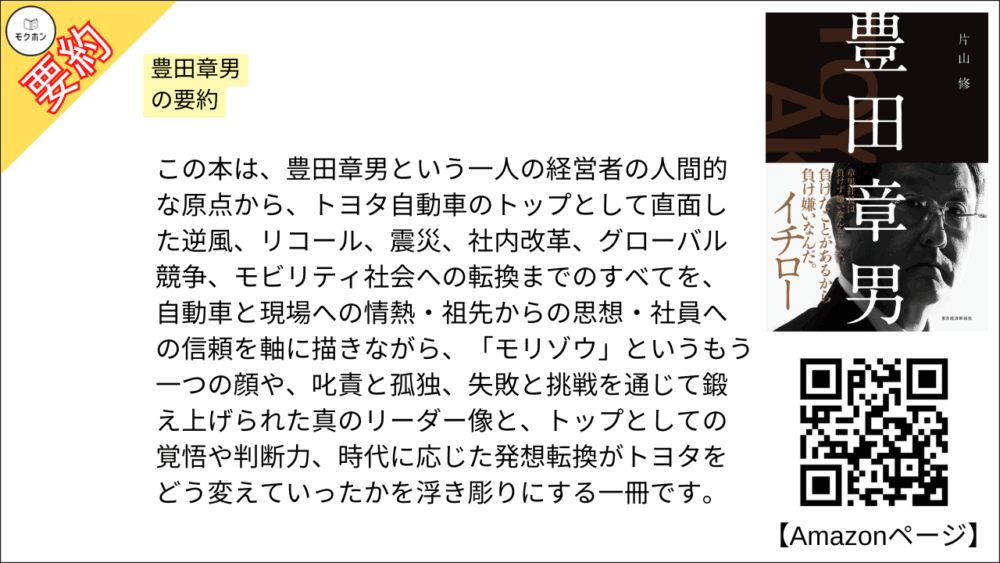 この本は、豊田章男という一人の経営者の人間的な原点から、トヨタ自動車のトップとして直面した逆風、リコール、震災、社内改革、グローバル競争、モビリティ社会への転換までのすべてを、自動車と現場への情熱・祖先からの思想・社員への信頼を軸に描きながら、「モリゾウ」というもう一つの顔や、叱責と孤独、失敗と挑戦を通じて鍛え上げられた真のリーダー像と、トップとしての覚悟や判断力、時代に応じた発想転換がトヨタをどう変えていったかを浮き彫りにする一冊です。