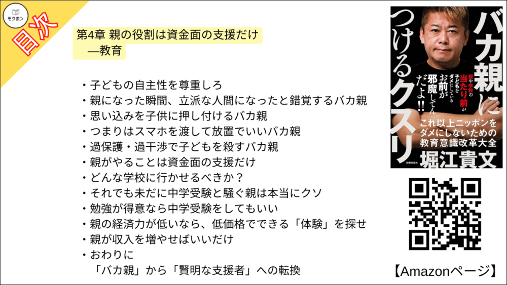 第4章 親の役割は資金面の支援だけ ―教育【堀江貴文・要点・もくじ・モクホン】