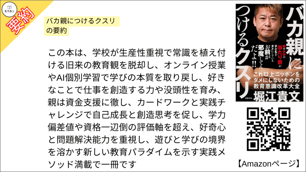 この本は、学校が生産性重視で常識を植え付ける旧来の教育観を脱却し、オンライン授業やAI個別学習で学びの本質を取り戻し、好きなことで仕事を創造する力や没頭性を育み、親は資金支援に徹し、カードワークと実践チャレンジで自己成長と創造思考を促し、学力偏差値や資格一辺倒の評価軸を超え、好奇心と問題解決能力を重視し、遊びと学びの境界を溶かす新しい教育パラダイムを示す実践メソッド満載で一冊です