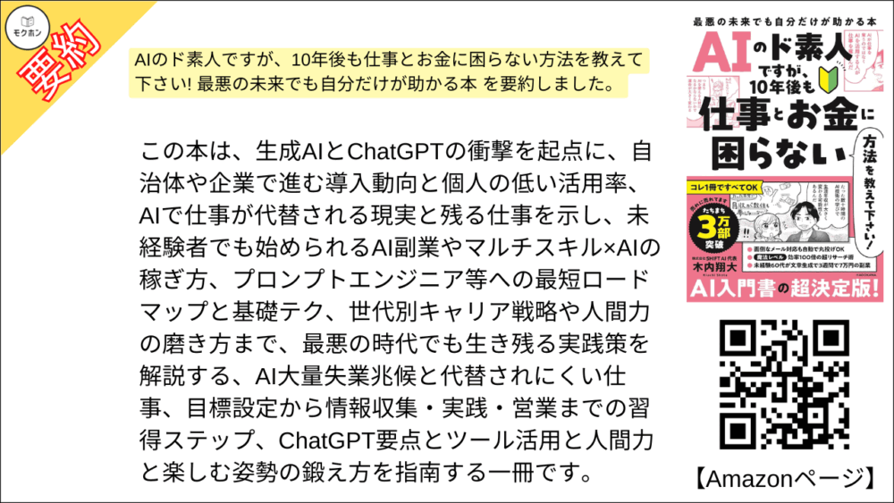 AIのド素人ですが、10年後も仕事とお金に困らない方法を教えて下さい! 最悪の未来でも自分だけが助かる本 を要約しました。