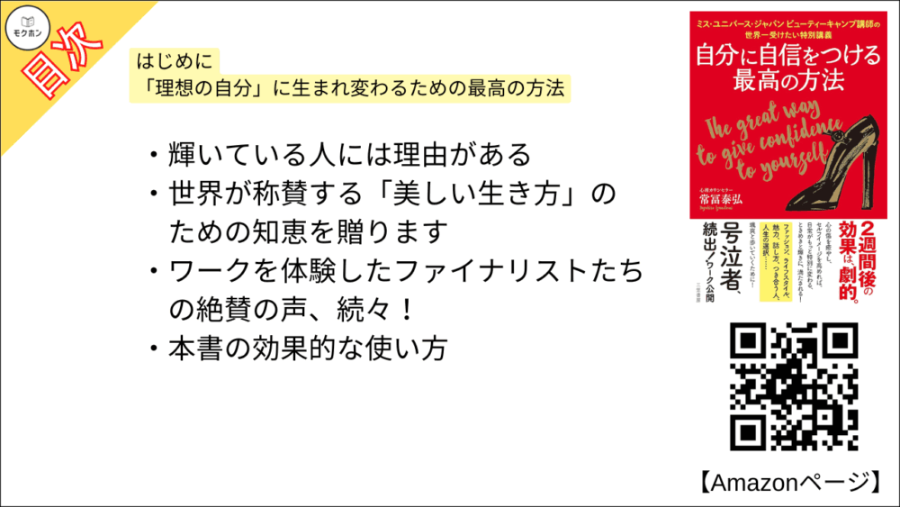 【自分に自信をつける最高の方法―――ミス・ユニバース・ジャパンビューティーキャンプ講師の世界一受けたい特別講義 目次】はじめに 「理想の自分」に生まれ変わるための最高の方法【常冨 泰弘・要点・もくじ】