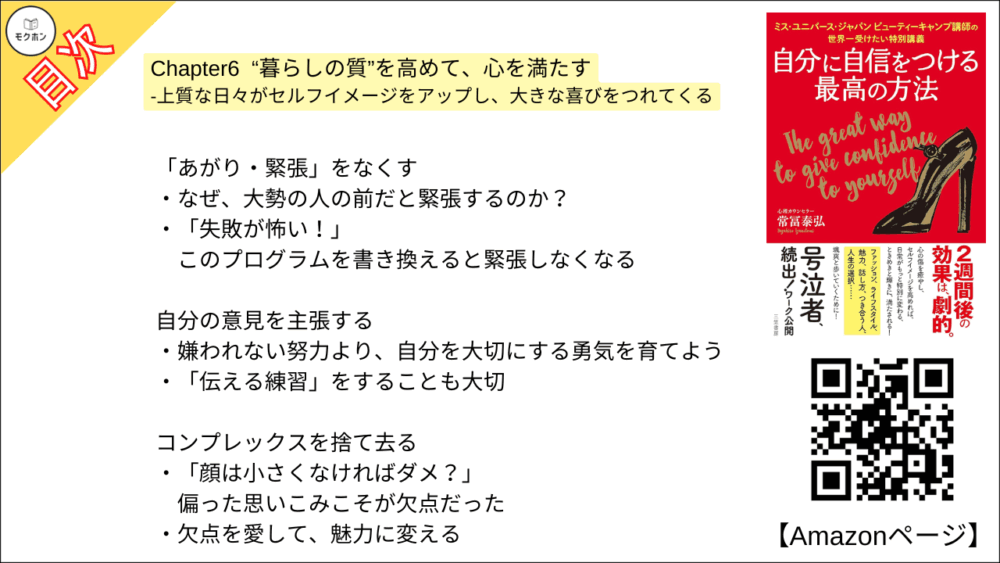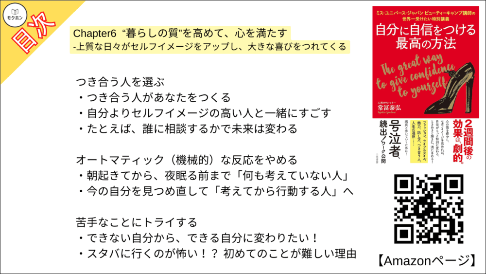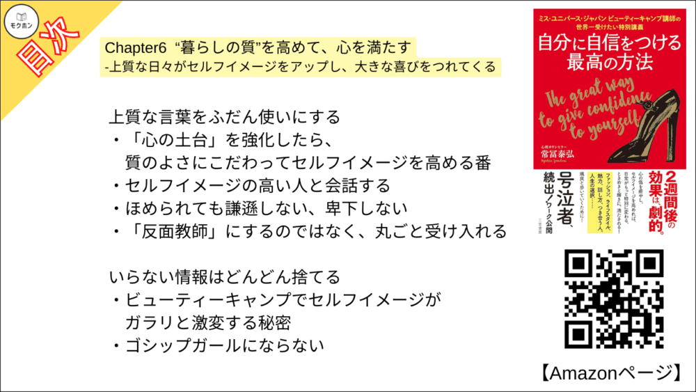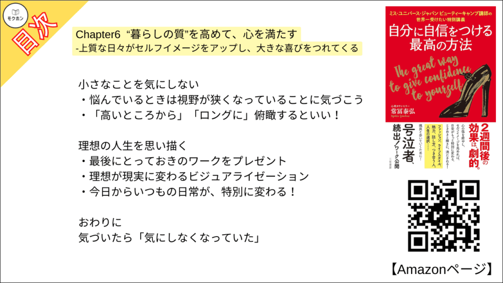 【自分に自信をつける最高の方法―――ミス・ユニバース・ジャパンビューティーキャンプ講師の世界一受けたい特別講義 目次】Chapter6 “暮らしの質”を高めて、心を満たす【常冨 泰弘・要点・もくじ】