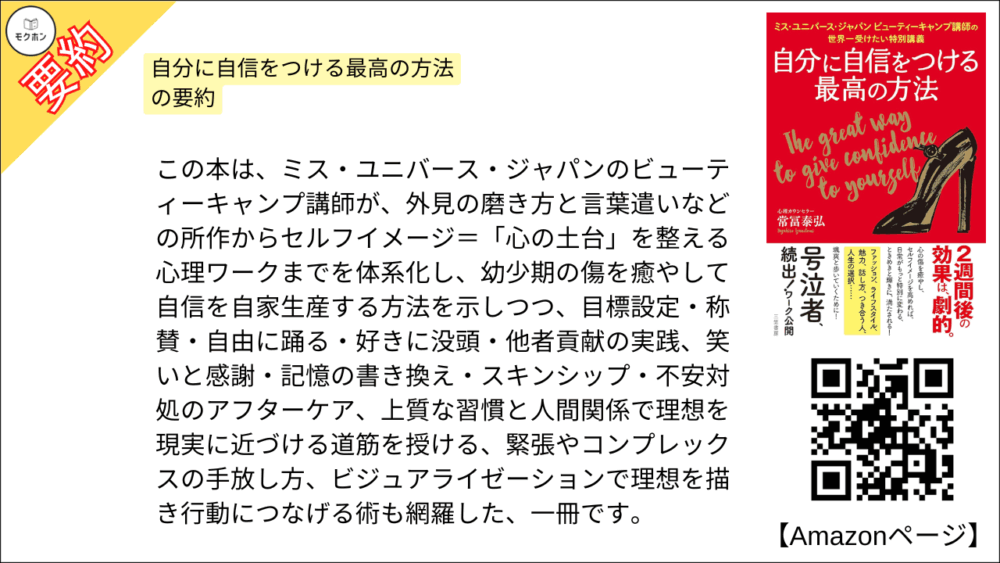 この本は、ミス・ユニバース・ジャパンのビューティーキャンプ講師が、外見の磨き方と言葉遣いなどの所作からセルフイメージ=「心の土台」を整える心理ワークまでを体系化し、幼少期の傷を癒やして自信を自家生産する方法を示しつつ、目標設定・称賛・自由に踊る・好きに没頭・他者貢献の実践、笑いと感謝・記憶の書き換え・スキンシップ・不安対処のアフターケア、上質な習慣と人間関係で理想を現実に近づける道筋を授ける、緊張やコンプレックスの手放し方、ビジュアライゼーションで理想を描き行動につなげる術も網羅した、一冊です。