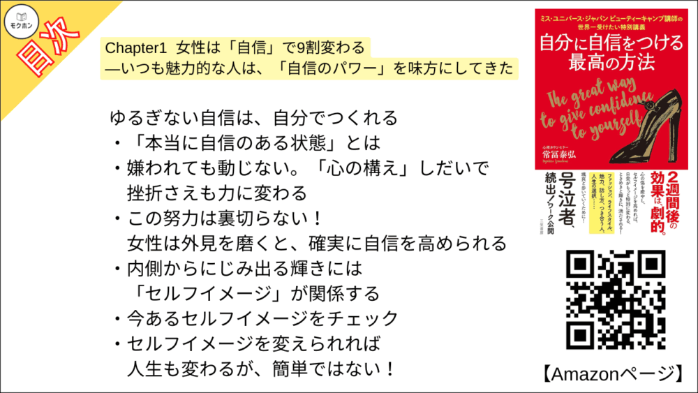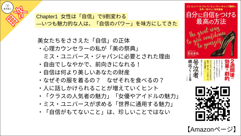 【自分に自信をつける最高の方法―――ミス・ユニバース・ジャパンビューティーキャンプ講師の世界一受けたい特別講義 目次】Chapter1 女性は「自信」で9割変わる【常冨 泰弘・要点・もくじ】