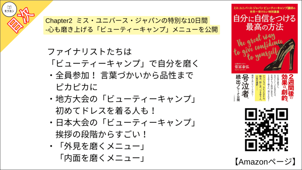 【自分に自信をつける最高の方法―――ミス・ユニバース・ジャパンビューティーキャンプ講師の世界一受けたい特別講義 目次】Chapter2 ミス・ユニバース・ジャパンの特別な10日間【常冨 泰弘・要点・もくじ】