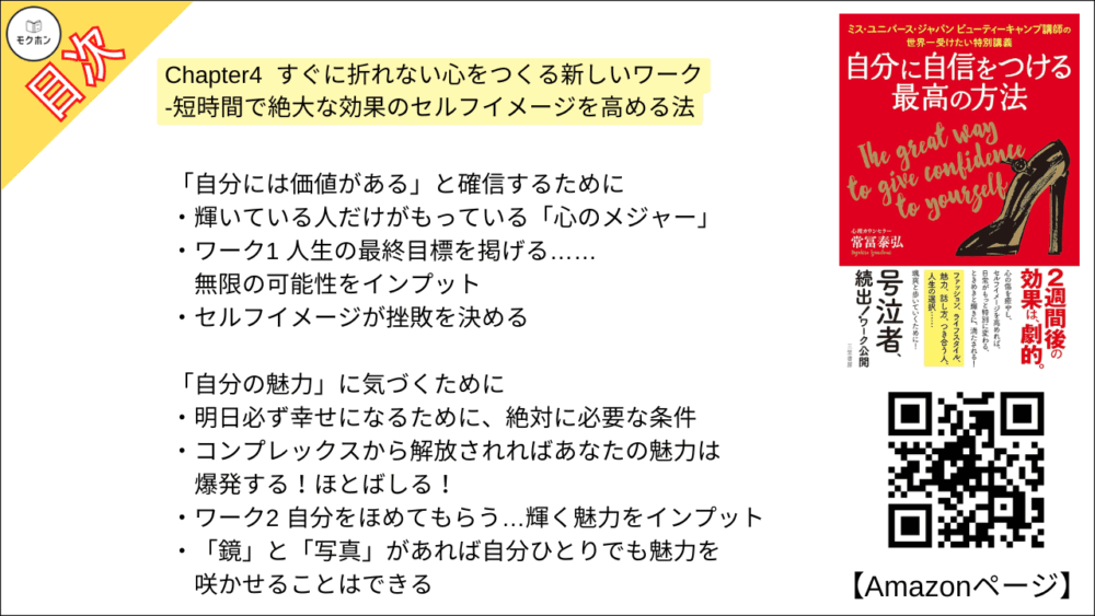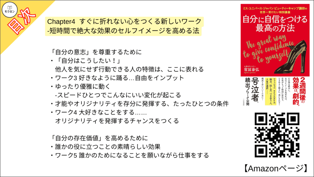 【自分に自信をつける最高の方法―――ミス・ユニバース・ジャパンビューティーキャンプ講師の世界一受けたい特別講義 目次】Chapter4 すぐに折れない心をつくる新しいワーク【常冨 泰弘・要点・もくじ】