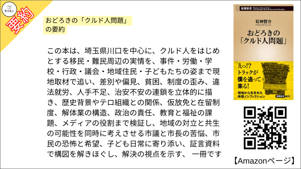 この本は、埼玉県川口を中心に、クルド人をはじめとする移民・難民周辺の実情を、事件・労働・学校・行政・議会・地域住民・子どもたちの姿まで現地取材で追い、差別や偏見、貧困、制度の歪み、違法就労、人手不足、治安不安の連鎖を立体的に描き、歴史背景やテロ組織との関係、仮放免と在留制度、解体業の構造、政治の責任、教育と福祉の課題、メディアの役割まで検証し、地域の対立と共生の可能性を同時に考えさせる市議と市長の苦悩、市民の恐怖と希望、子ども日常に寄り添い、証言資料で構図を解きほぐし、解決の視点を示す、 一冊です