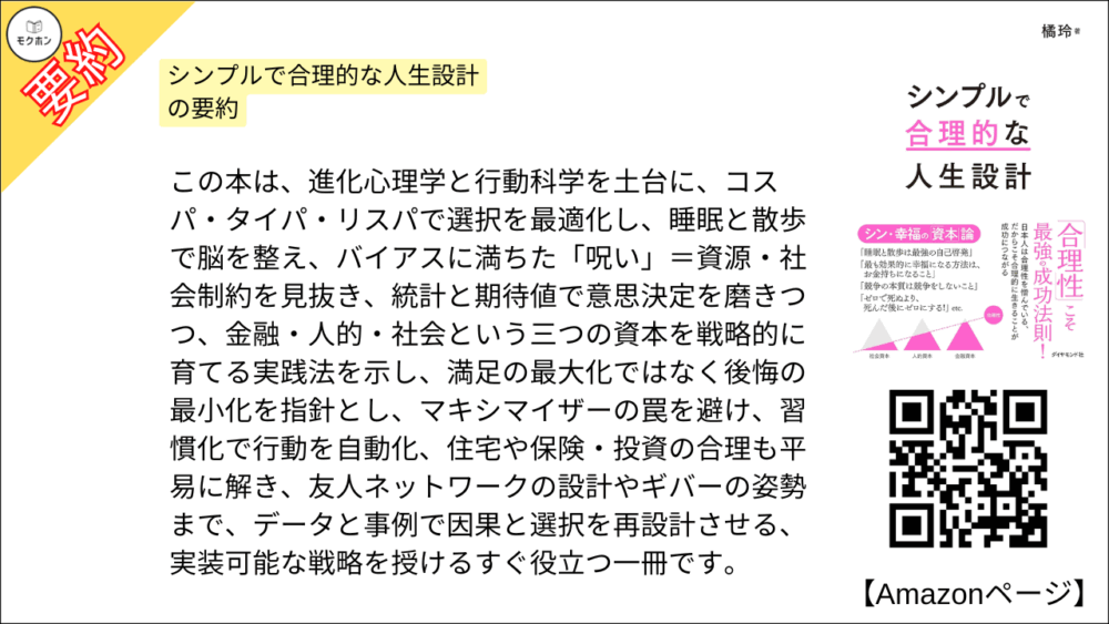 この本は、進化心理学と行動科学を土台に、コスパ・タイパ・リスパで選択を最適化し、睡眠と散歩で脳を整え、バイアスに満ちた「呪い」=資源・社会制約を見抜き、統計と期待値で意思決定を磨きつつ、金融・人的・社会という三つの資本を戦略的に育てる実践法を示し、満足の最大化ではなく後悔の最小化を指針とし、マキシマイザーの罠を避け、習慣化で行動を自動化、住宅や保険・投資の合理も平易に解き、友人ネットワークの設計やギバーの姿勢まで、データと事例で因果と選択を再設計させる、実装可能な戦略を授けるすぐ役立つ一冊です。