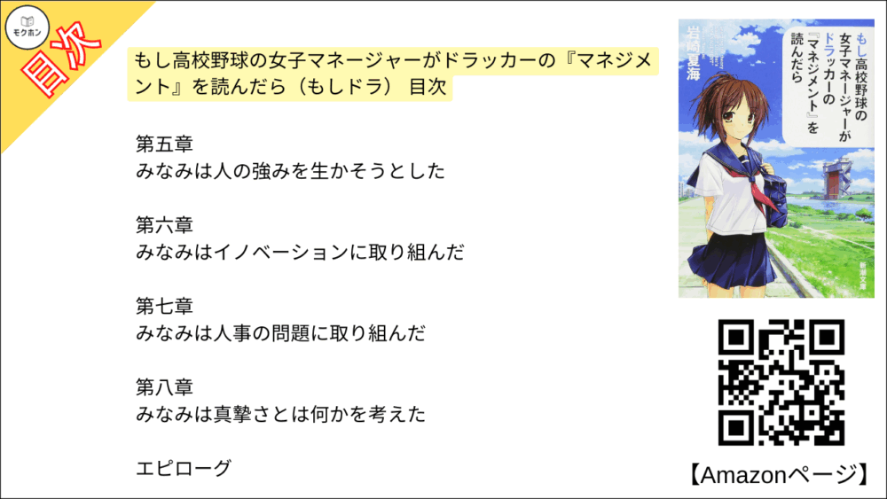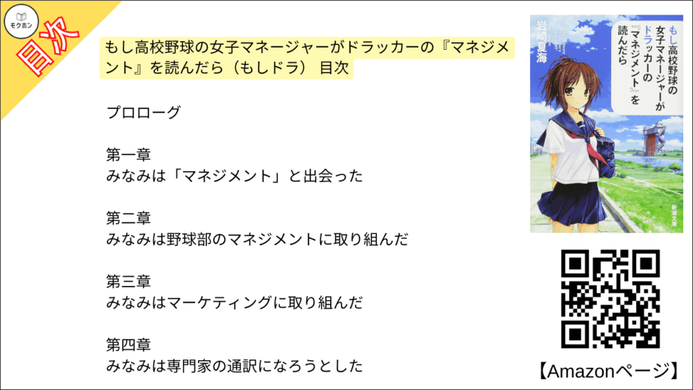 岩崎 夏海さんの「もし高校野球の女子マネージャーがドラッカーの『マネジメント』を読んだら(もしドラ)」の全もくじを紹介します。