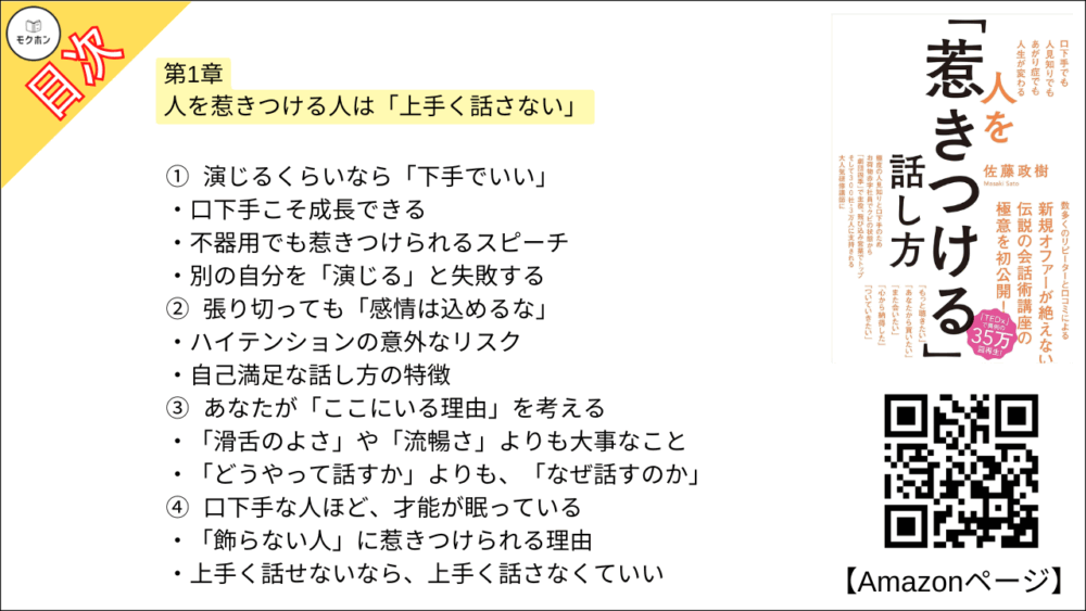 【人を「惹きつける」話し方――口下手でも人見知りでもあがり症でも人生が変わる 目次】第1章 人を惹きつける人は「上手く話さない」【佐藤 政樹・要点・もくじ・モクホン】