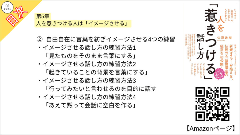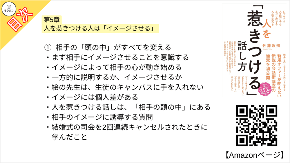 【人を「惹きつける」話し方――口下手でも人見知りでもあがり症でも人生が変わる 目次】第5章 人を惹きつける人は「イメージさせる」【佐藤 政樹・要点・もくじ・モクホン】