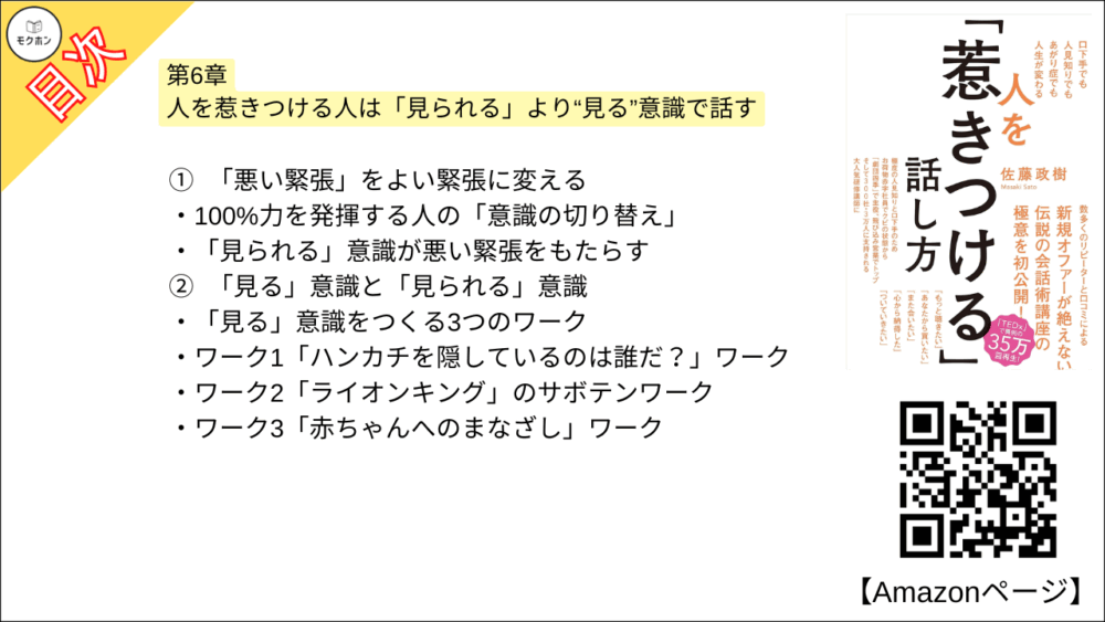【人を「惹きつける」話し方――口下手でも人見知りでもあがり症でも人生が変わる 目次】第6章 人を惹きつける人は「見られる」より“見る”意識で話す【佐藤 政樹・要点・もくじ・モクホン】